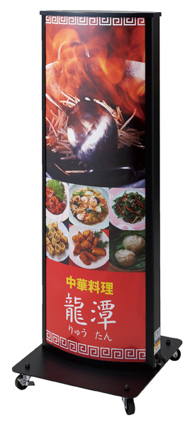 透明板と乳半板の間に表示シートを挟みこむ、表面がアール形状のスタンドサイン。